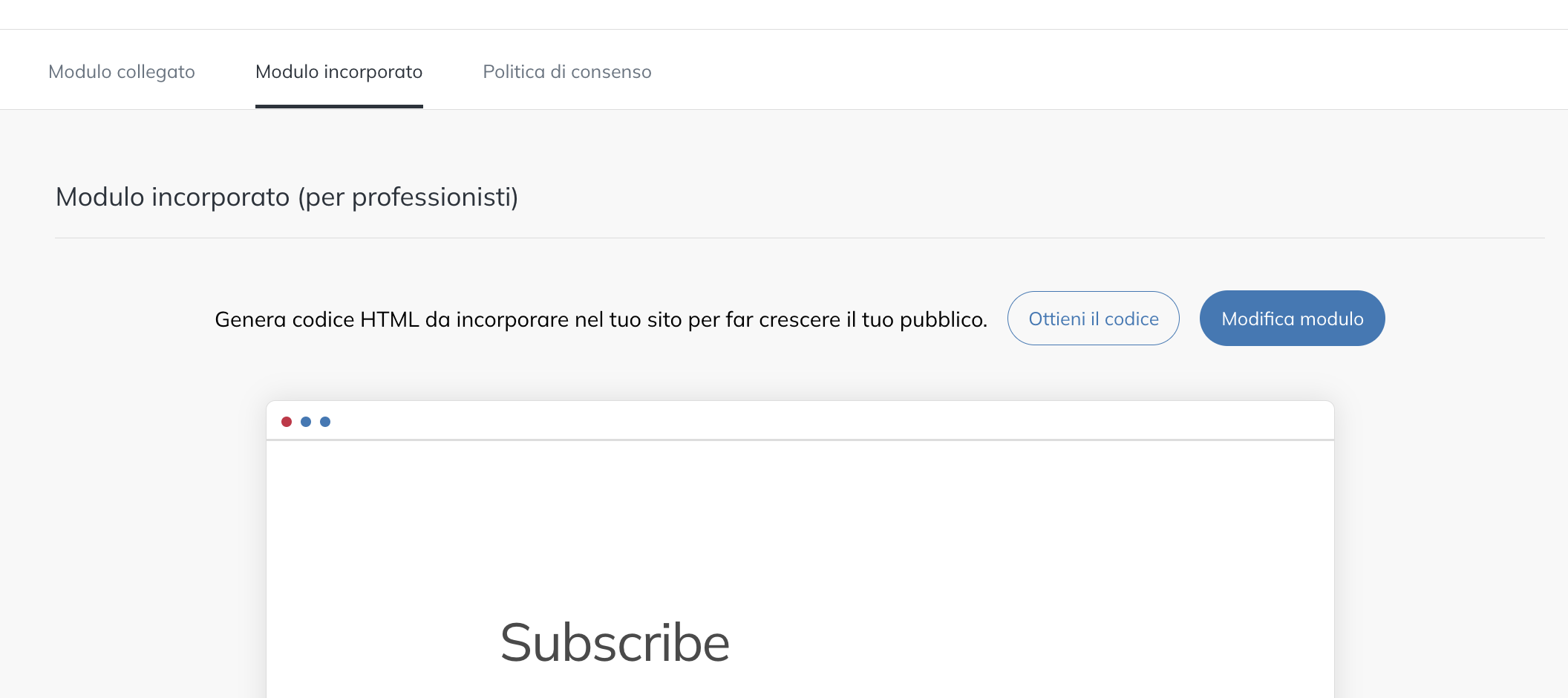 - La scheda Modulo incorporato ti fornirà il codice HTML da integrare in una pagina del tuo sito web. Clicca su Ottieni codice, quindi incollalo nella posizione desiderata del tuo sito web.