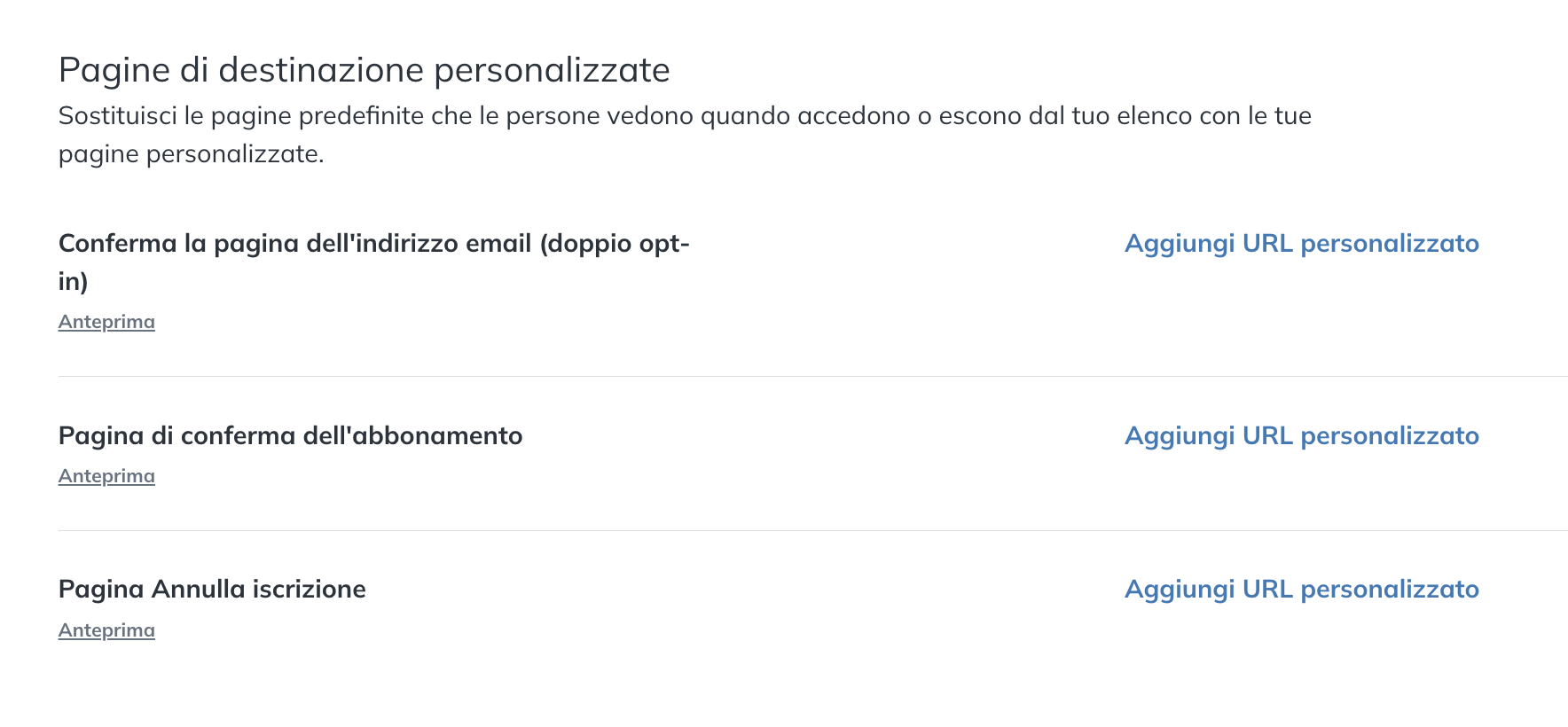 Vai a Contatti e seleziona l'icona dell'ingranaggio. Fare clic su Impostazioni e quindi su Aggiungi URL personalizzato a destra della Pagina di conferma dell'abbonamento o Conferma la pagina dell'indirizzo e-mail (doppio opt-in).