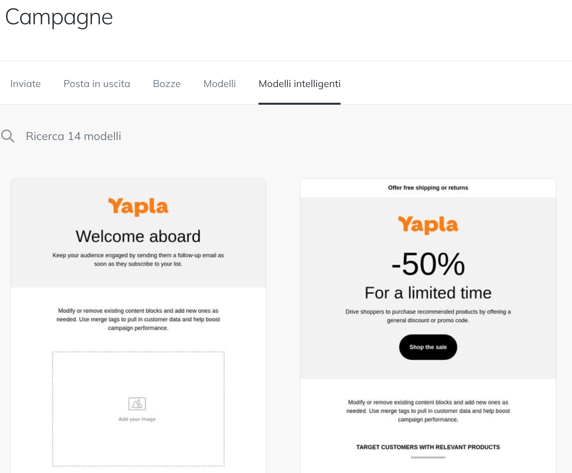Per scegliere e usare un modello intelligente, vai su Campagne > Modelli intelligenti. Il tuo logo e i tuoi colori saranno già inclusi nei modelli disponibili. Per usarne uno, clicca su Crea una campagna sotto il modello desiderato. Verrai reindirizzatə all’editor di contenuto dell’email.