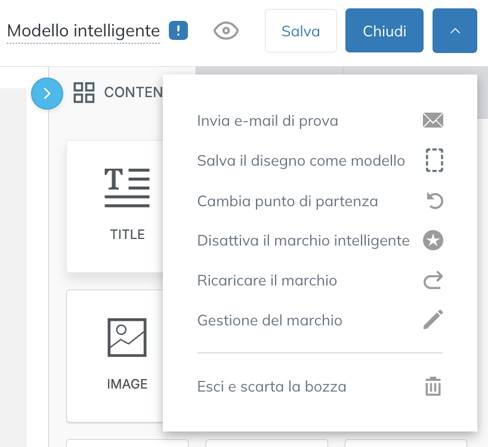 Se vuoi modificare elementi legati al tuo marchio in un modello intelligente, da quel modello clicca sulla freccia in alto a destra e seleziona Disattiva il marchio intelligente.