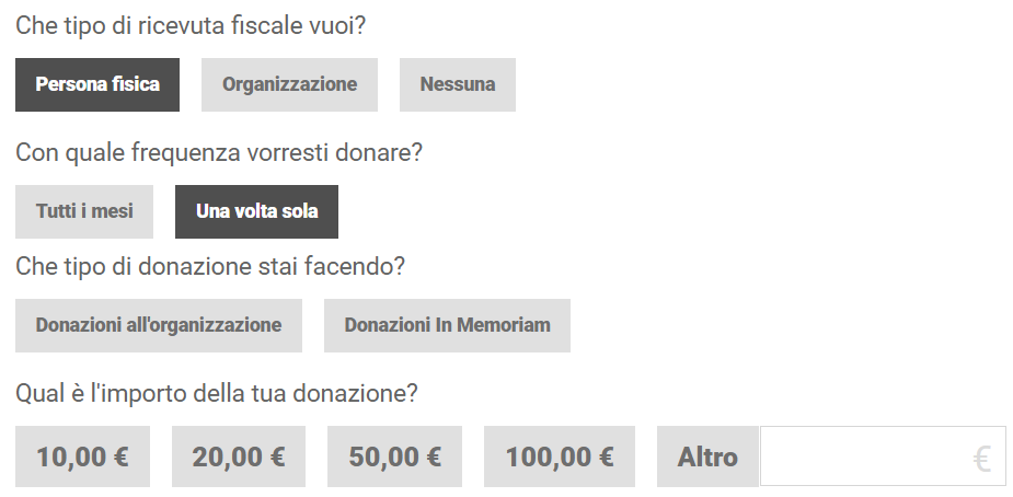 Non appena avrai creato i 2 tipi di donazioni, verranno automaticamente proposti nel tuo modulo.