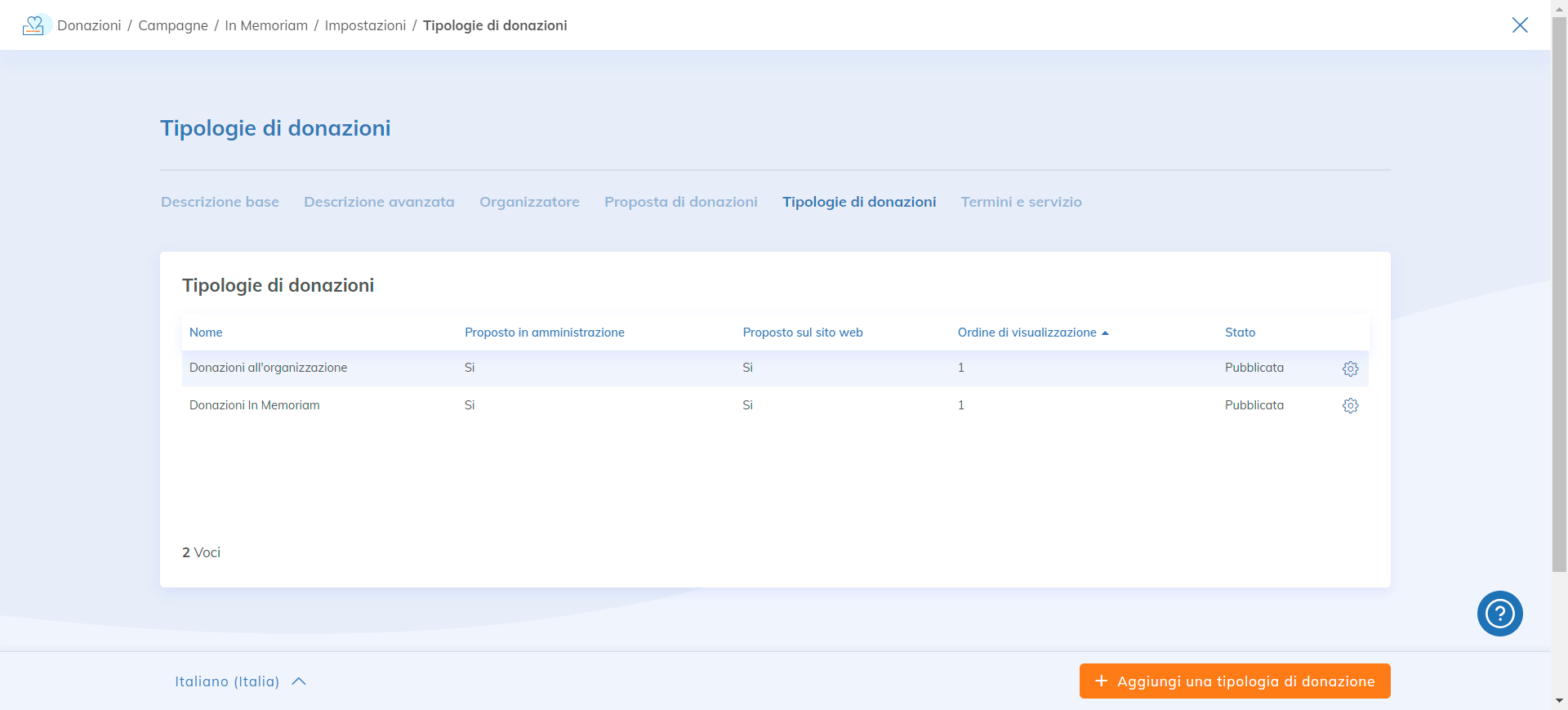 Per ogni tipologia, scegli l'ordine in cui verrà visualizzato, attiva le caselle di controllo Proposto all'amministratore e Proposto sul sito web in modo che il tipo di donazione compaia nel processo di donazione e scegli il modulo associato.
